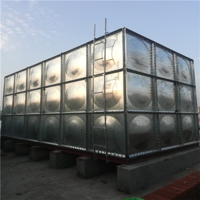 鍍鋅水箱采用q235鋼板,沖壓形成1000*1000和1000*500 、500*500的標準塊,周邊鉆孔,經(jīng)鍍鋅處理,現(xiàn)場進行組裝,組裝時標準塊之間硅膠密封,螺栓連接。熱鍍鋅水箱的進水管、出水管及溢流管的管徑、位置由設計決定;水箱四周應有不少于700mm通道,箱底及箱頂不少于600mm。安裝時箱底四周及箱底標準快之間的連接縫隙要坐落在支座上。